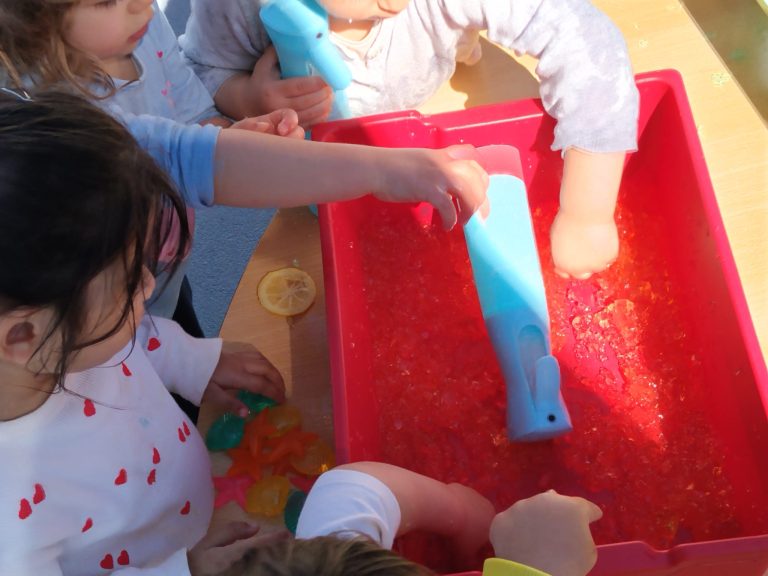 Para além disso, foram disponibilizados materiais com variadas texturas, como areia, gelatina, relva, tecidos e elementos naturais, incentivando a exploração sensorial, tátil e a descoberta. Estas experiências são fundamentais nesta fase do desenvolvimento, ajudando as crianças a conhecer o mundo através do corpo e dos sentidos, e do contacto com a natureza, alinhado com o projeto educativo da Instituição.